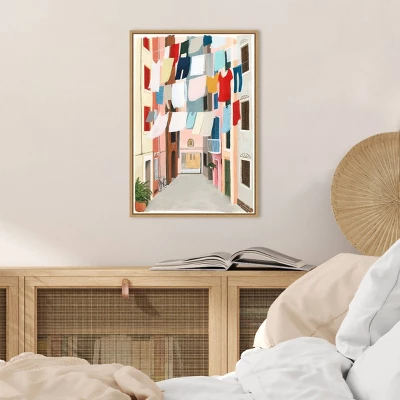 ART DESCRIPTION: This colorful scene from a city alley celebrates the realities of urban living. Lines of colorful clothes hang drying in the wind between the buildings. They almost look like foliage or a flock of colorful birds in repose. This Amanti Art canvas art print was created by Grace Popp and printed by Amanti Art in Madison WI. The canvas is stretched by hand and finished with a float frame. Individually made using traditional custom framing techniques, it has the quality you would expect from your local frame shop. Because of our attention to detail and focus on artistry, architects, interior designers, and homeowners alike choose this framed canvas artwork to create beautiful living spaces.