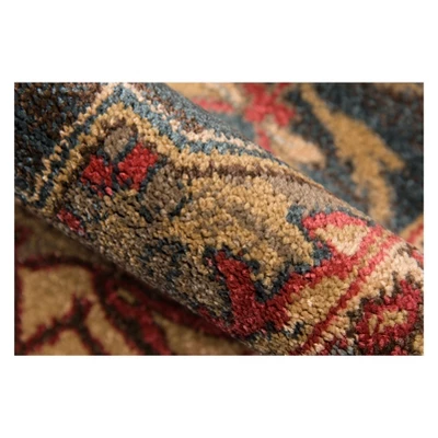 The ornamental elegance of this traditional area rug has deep roots in old world design motifs. Evoking the timeless visual elements inspired by classic Kazak carpets, an eye-catching geometric field of medallions, palmettes and flowers is surrounded by an intricate border in regal shades of crimson red, blue and gold. With references to centuries-old Heriz and Serapi rug patterns, each elaborate rug design is elegantly crafted from soft synthetic fibers, while power-loomed precision ensures this traditional floorcovering will truly stand the test of time.