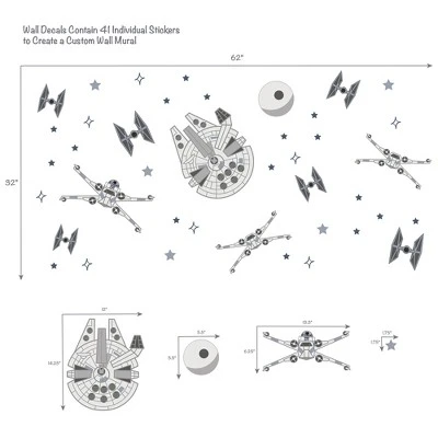 Create an intergalactic mural design depicting a classic Star Wars space scene. This complete set of wall decals includes 6 Tie Fighters, 3 X-Wings, 1 Millennium Falcon, 1 Death Star, and 30 galaxy stars. Design the scene however you like, just like a custom mural. There are 4 sheets that are 12β X 18β each and a total of 41 pre-cut decals/stickers. The finished size is approximately 61 Β½β X 31 Β½β as shown. Your little Padawan (Jedi-in-training) will love waking up to a galaxy far far away.