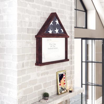 Honor the memory of your loved one or celebrate their current achievements with this solid wood flag display case with certificate holder. The thick glass front panels proudly display your flag and any other memorabilia while preventing dust or debris from reaching your keepsakes. This shadowbox may be placed freestanding on any level surface or hung on the wall to best suit your needs. Hanging hardware and flag folding instructions are included
