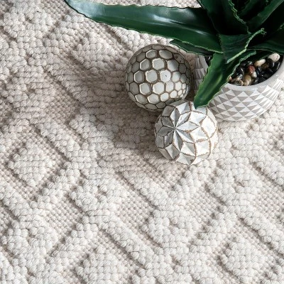 Bring texture and dimension to your living room with the trellis pattern of this nuLOOM Diamond Hubbard area rug. The wool pile ensures durability and is resistant to stains for use in high-traffic areas and homes with pets or children. The neutral ivory color matches easily with a variety of decors.