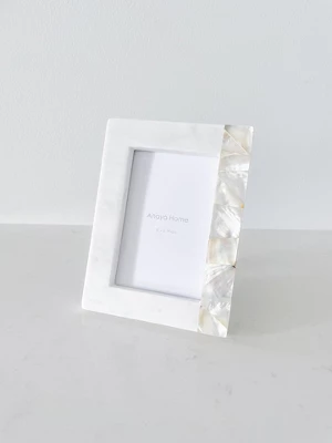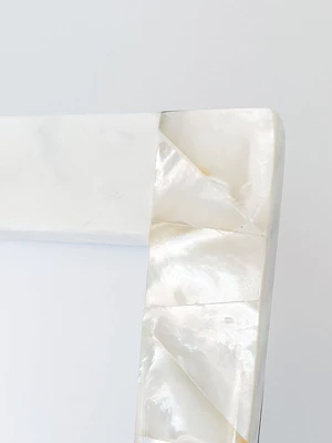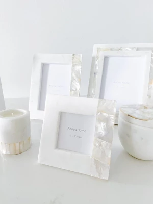 The White Mother of Pearl White Marble Picture Frame features the Genuine Mother of Pearl stripe accent with a natural iridescent White and Golden color tone. When light hits each piece, the iridescent colors shine bright against the White Marble background creating a luxurious, natural experience. Each piece is hand made; white gift box included.